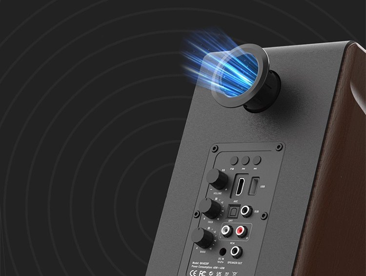 Powered by high-precision professional tuning and DSP digital audio processing, this 2.0-channel Hi-Fi bookshelf speaker delivers a stable output of 40W + 40W (80W total), an 80dB signal-to-noise ratio, and a frequency response of 35Hz–20kHz, ensuring high-resolution sound reproduction. The system utilizes a 1.25-inch tweeter and a 4-inch (116mm) dynamic woofer. The metal diaphragm enhancer and the air circulation design inside the bass tube effectively extend the bass and control cabinet resonance, resulting in rich, natural bass and crisp, clear high-end detail.